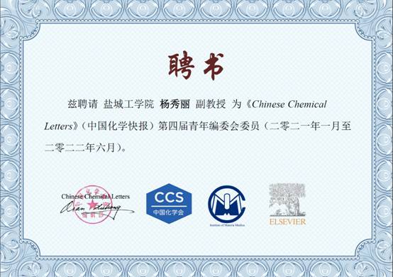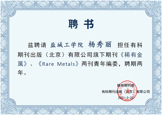 近日,江苏省新型环保重点实验室杨秀丽博士相继被SCI二区期刊《Chinese ChemicalLetters》(中国化学快报)和《Rare Metals》(稀有金属)聘为青年编委,时间分别为一年半和两年。青年编委一般从年龄小于40周岁、具有国际视野、且专业水平拨尖的青年人才中产生。