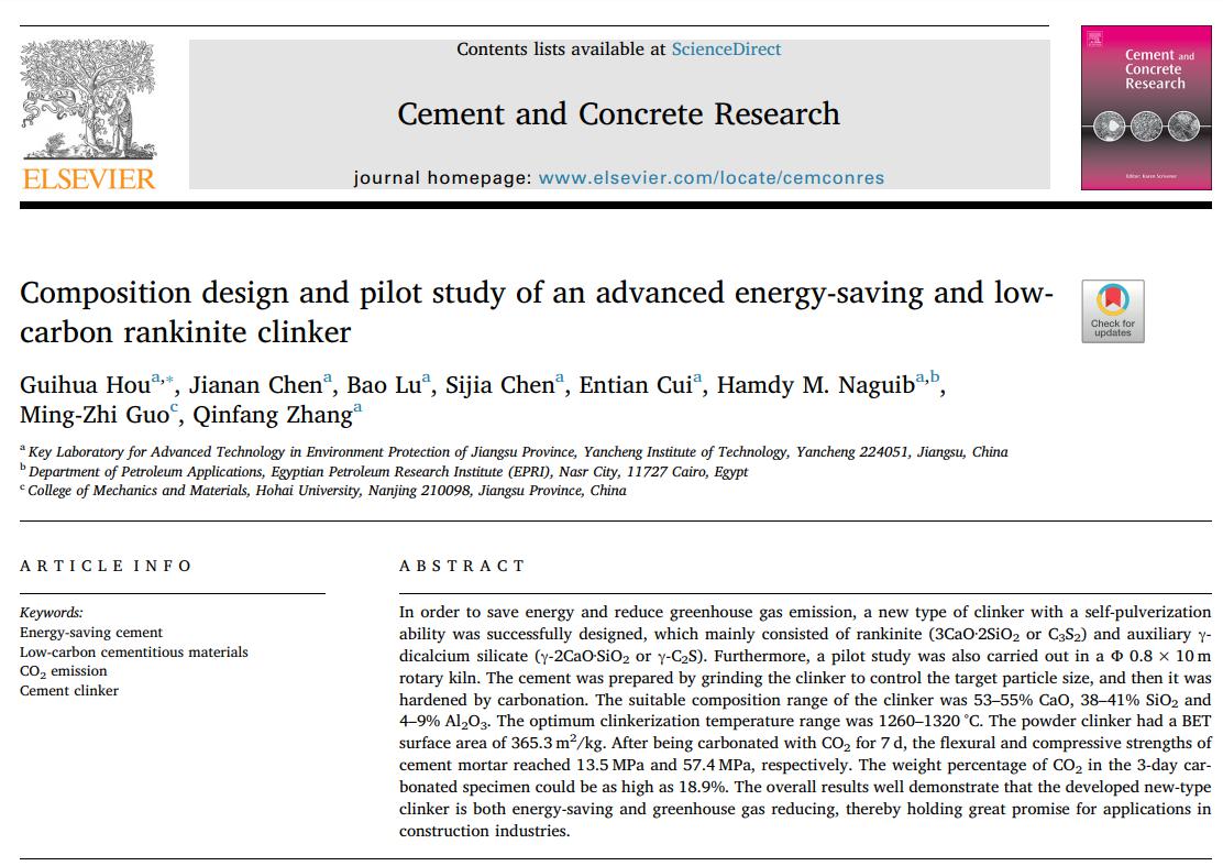 近日,我校省新型环保重点实验室侯贵华教授为第一作者,盐城工学院为第一单位的研究论文《Composition design and pilot study of an advanced energy-saving and low carbon rankinite clinker》(Cem. Concr. Res., 2020, 127, 105926)在水泥与混凝土类顶级期刊《Cement and Concrete Research》上发表。