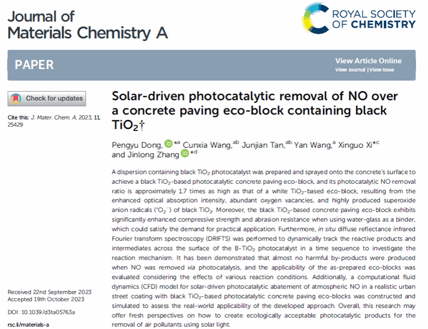 近日,我室董鹏玉博士为第一作者、以盐城工学院为第一单位的研究论文“Solar-driven photocatalytic removal of NO over a concrete paving eco-block containing black TiO2在材料类顶级期刊《Journal of Materials Chemistry A》(2023, 11, 25429-25440)上发表。《Journal of Materials Chemistry A》是英国皇家化学会RSC旗下重要期刊,该期刊2022年影响因子为14.511,主要刊登能源与可持续材料化学领域高水平的研究成果,属于材料学科Top期刊。