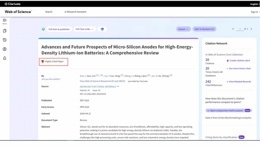 近期,根据Essential Science Indicators (ESI)数据库检索结果显示,我室孙林博士为第一/通讯作者,盐城工学院为第一单位发表在Advanced Functional Materials的论文《Advances and Future Prospects of Micro-Silicon Anodes for High-Energy-Density Lithium-Ion Batteries: A Comprehensive Review》 ,在对应领域和出版年中的引用的次数已归入其学术领域中最优秀的1%之列,被收录为ESI材料学科“高被引论文”(Highly Cited Papers)。