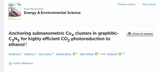 近日,我室崔恩田博士为第一作者、以盐城工学院为第一单位的研究论文“Anchoring subnanometric Cu4 clusters in graphitic-C3N5 for highly efficient CO2 photoreduction to ethanol. ”在顶级期刊《Energy & Environmental Science》上发表。该学术期刊是英国皇家化学会的旗舰期刊、公认的能源与环境科学领域顶尖刊物,影响因子32.5。