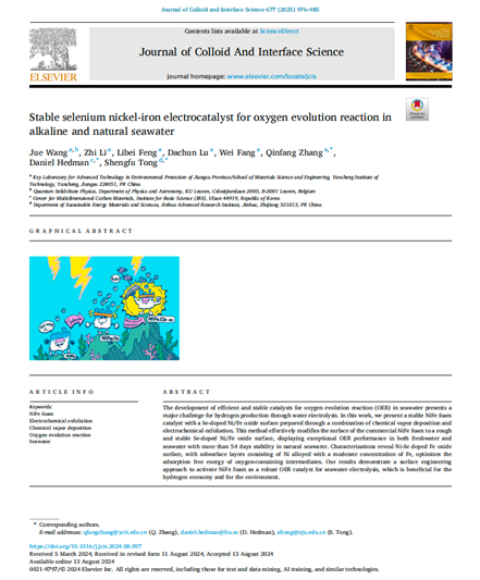 近日,江苏省新型环保重点实验室王珏博士为第一作者,张勤芳教授为通讯作者、盐城工学院为第一单位的研究论文《Stable selenium nickel-iron electrocatalyst for oxygen evolution reaction in alkaline and natural seawater》(Journal of Colloid and Interface Science 677 (2025) 976-985) 在化学、材料领域一区TOP期刊《Journal of Colloid And Interface Science》上发表(该刊2024年影响因子为9.4)。