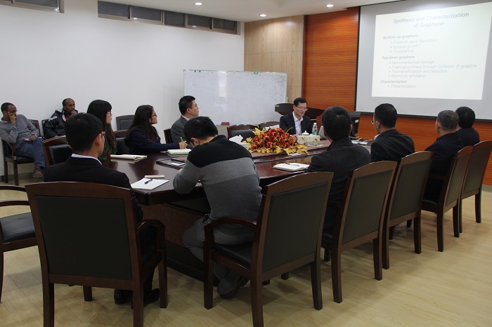 吴沅春教授介绍了二维材料石墨烯的特性及其应用研究进展,化学气相沉积法合成石墨烯的优缺点,层数可控、大面积、高质量石墨烯合成的关键技术等。报告会后,吴沅春教授与重点实验室教师就合作开展石墨烯新材料研究进行了讨论。