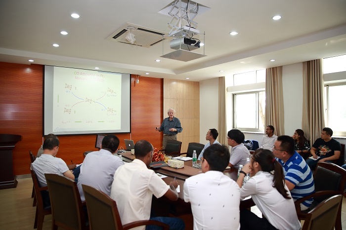 Jellinek教授详细介绍了美国Argonne国家实验室基于材料设计和实验研究,以及在合金团簇的结构、性质、催化活性位等方面取得的研究成果。报告会后,Jellinek教授参观了实验室团簇催化平台,并与重点实验室教师就开展合作研究进行了深入的讨论。
