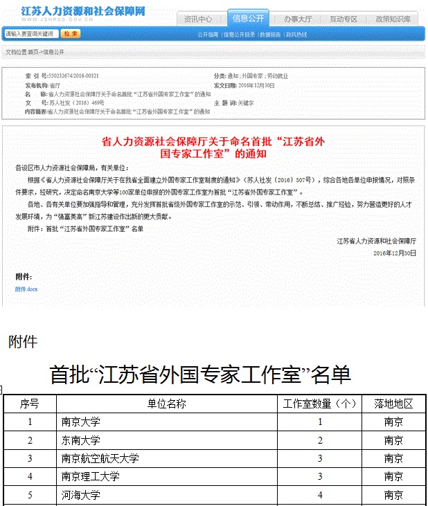 近日,省人力资源社会保障厅发布《省人力资源社会保障厅关于在我省全面建立外国专家工作室制度的通知》(苏人社发〔2016〕307号),决定命名100家单位申报的外国专家工作室为首批“江苏省外国专家工作室”。我校江苏省新型环保重点实验室申报的外国专家工作室获批。外国专家工作室制度是江苏在国内率先建立的,是创新引才引智机制,改进外国人才管理服务,集聚高层次外国人才的重要举措。